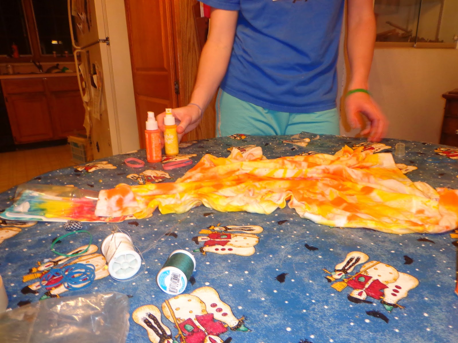 3) After you are done adding color, you will want to hang your shirt to dry. I learned that to make the colors run, you want to hang your shirt up to dry, but if you want your designs to stay the same, lay the shirt flat to dry. I really enjoyed how it turned out.